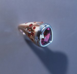 N11b-Angled Ring with Diamonds, Rubies in 18k Pink Gold & Platinum